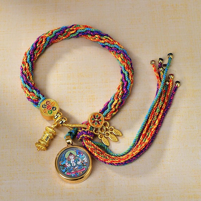 Embrace the essence of Tibetan spiritual craftsmanship with this Handwoven Tibetan Thangka Bracelet, a powerful amulet of wisdom, protection, and divine blessings. Featuring a beautifully braided multicolored cord, this bracelet incorporates sacred Buddhist symbols, making it a perfect talisman for spiritual seekers.
