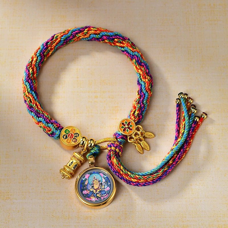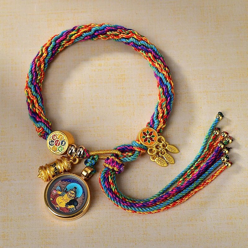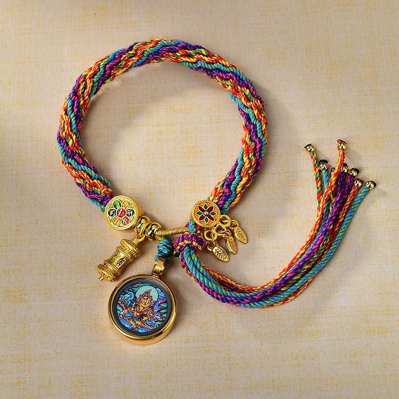Embrace the essence of Tibetan spiritual craftsmanship with this Handwoven Tibetan Thangka Bracelet, a powerful amulet of wisdom, protection, and divine blessings. Featuring a beautifully braided multicolored cord, this bracelet incorporates sacred Buddhist symbols, making it a perfect talisman for spiritual seekers.